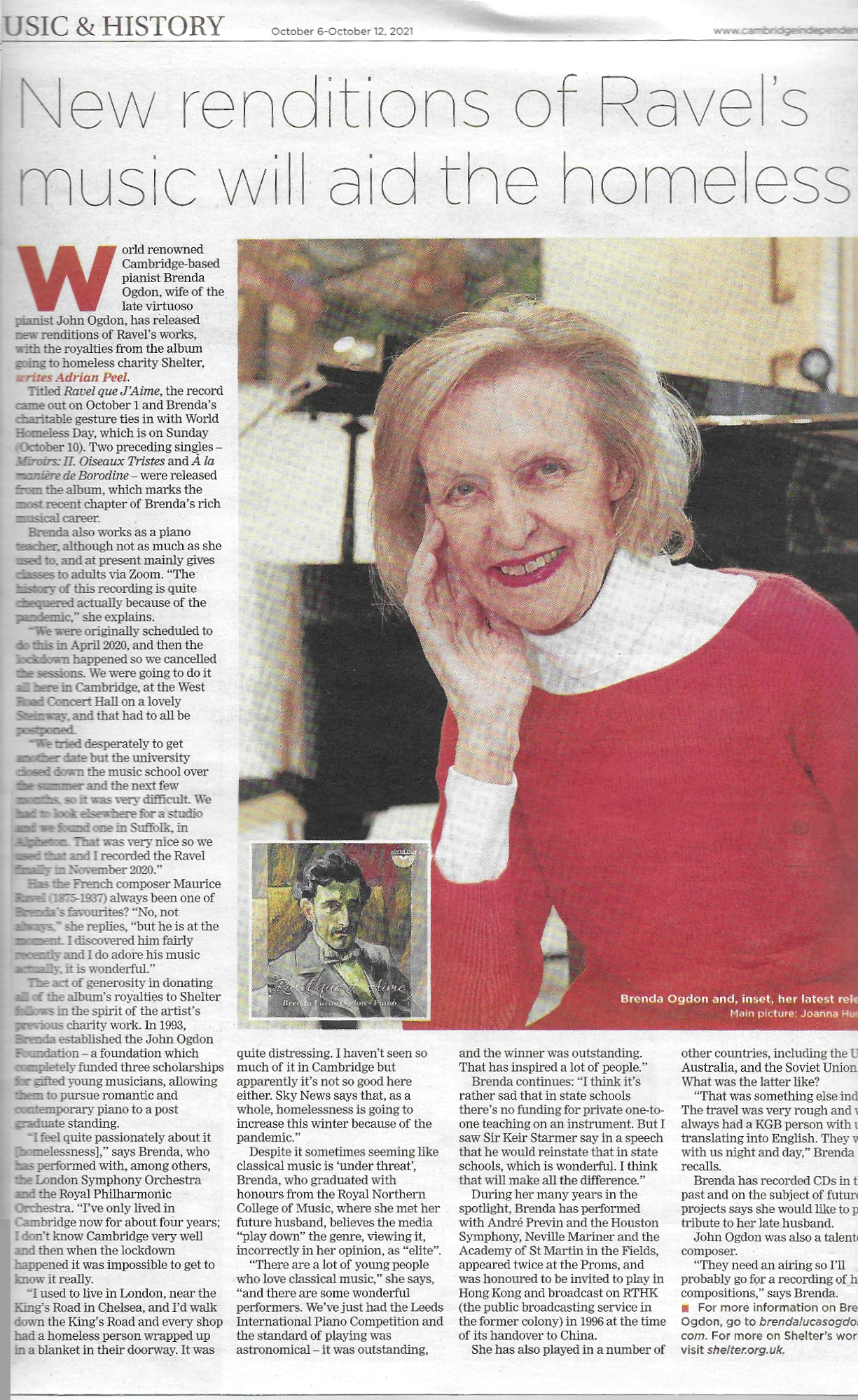 On 1 October 2021 Brenda Lucas Ogdon released a new CD of piano music by Ravel to raise funds for the housing and homelessness charity Shelter.
